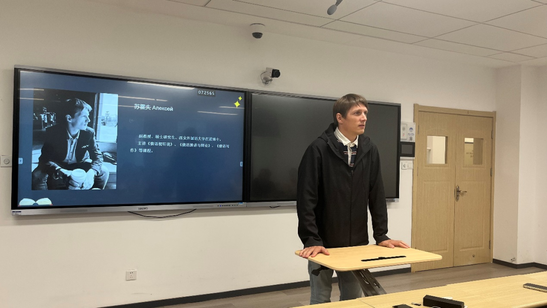 俄语专业外籍教师АЛЕКСЕЙ向同学们分享了自己学习中文的经历,他表示,学习语言最重要的是热爱和兴趣,俄语是一门非常严谨的语言,希望同学们在日后的学习中发现俄语的魅力。
