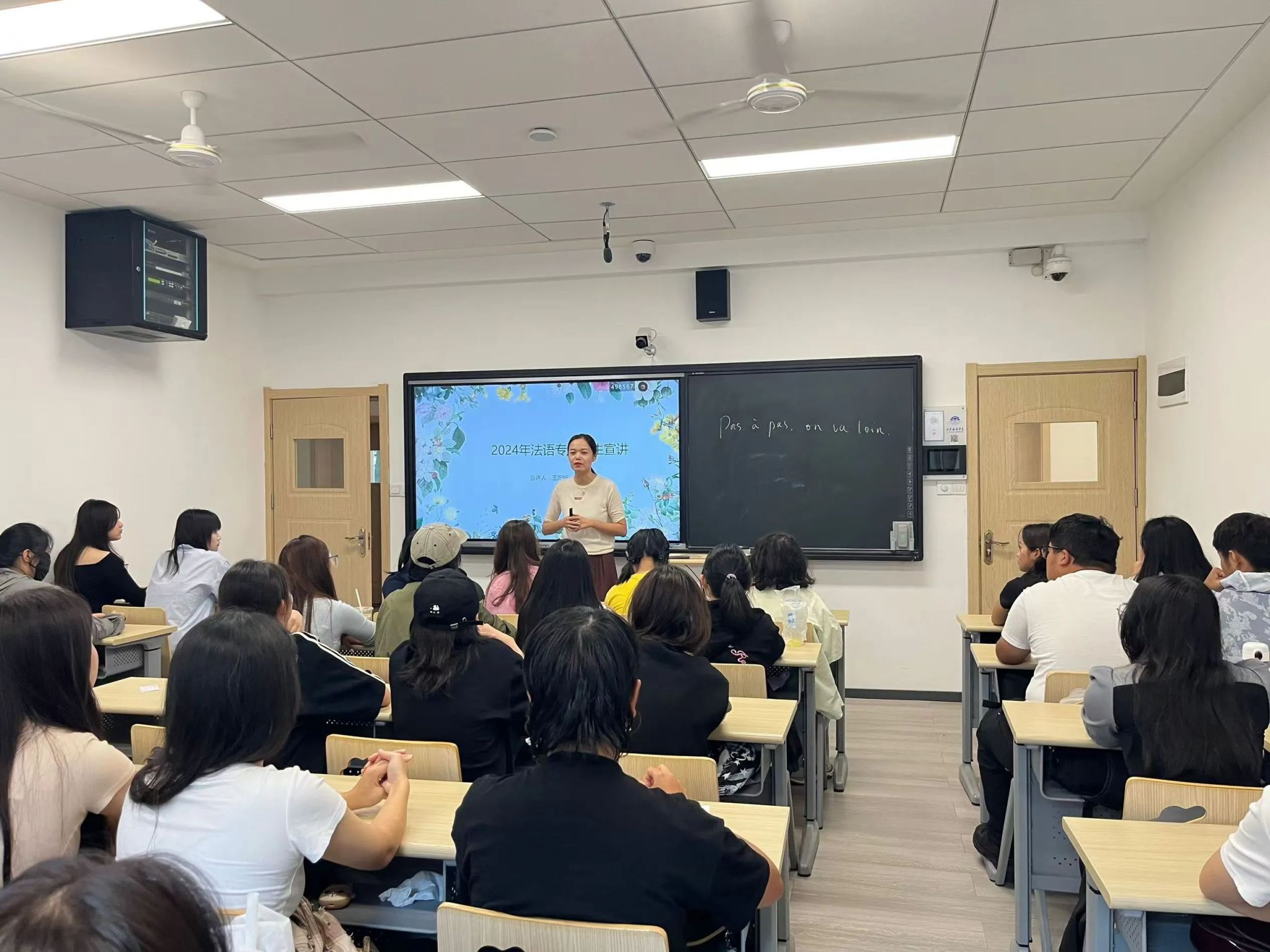 法语系主任王姗姗以法国著名作家雨果在《九三年》中的一段关于法国的描述为开篇,激发同学们对于法国文化的兴趣。她介绍了公司与法语专业的整体情况,包括专业沿革、特色与优势、团队力量。随后,她紧紧围绕2022版法语专业人才培养方案、第二课堂开展情况国际交流情况,对于课程体系、各项法语水平赛事、法语讲座、外文艺术节、实习实训活动等进行了整体的介绍,并就四年期间法语专业员工可以考取的等级证书、职业资格证书及相关支撑课程作了详尽地解答,鼓励大家充分利用四年有限的时间打下坚实的专业基本功,在学好法语的同时,多参加国际间的文化交流活动,在实践中锻炼自己的语言水平及跨文化交际能力,培养国际化视野。