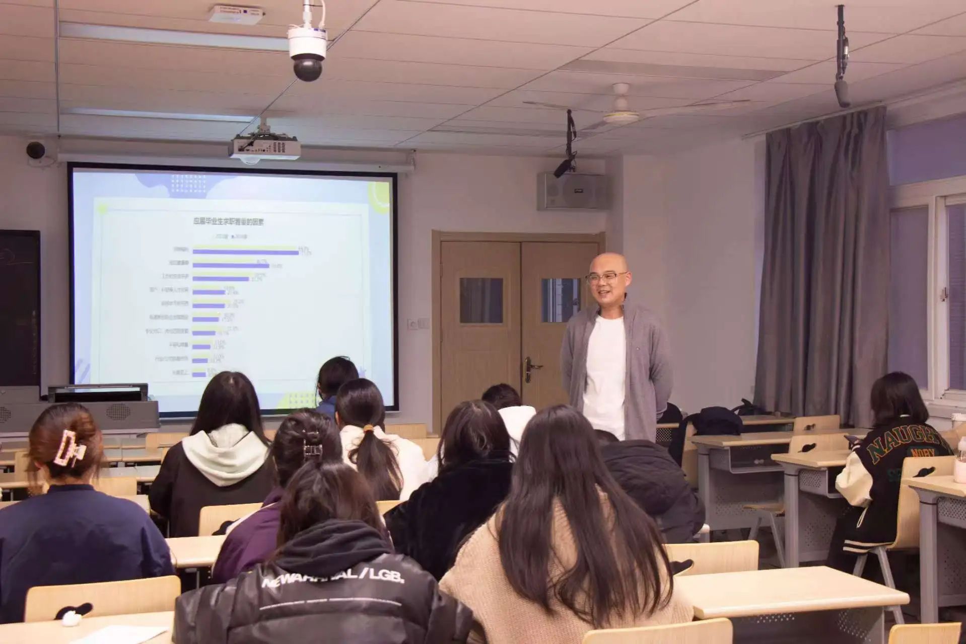 会议伊始,富山公司市场部经理隋宜霖针对应届毕业生求职看中的因素进行分析,提出老员工就业破局要从心态、技能、视野、资源等多个方面入手。随后,他分析了小语种专业在国内的就业现状,阐述了选择小语种教育行业就业的优势,同时对该行业未来发展及“德国双元制”项目进行了介绍。重点讲解了双元制职业培训、项目优势、专业岗位、项目参与方式等员工关心的内容。最后,通过丰富的图文资料,展示了多位在富山公司成长起来的优秀教师的发展路径和卓越成就。隋宜霖表示,公司高度重视人才,期待通过此次宣讲会吸引更多德语专业的同学加入,为公司发展增添新动力,共同书写辉煌。