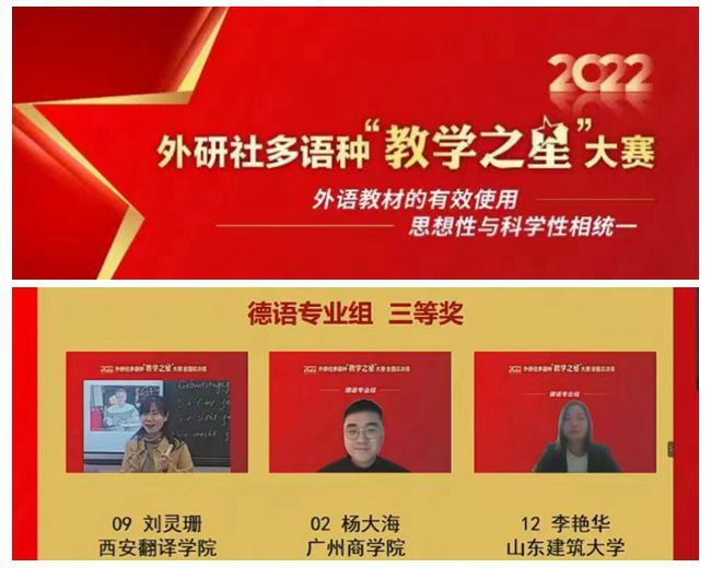 12月17日,由北京外国语大学中国外语与教育研究中心、北京外国语大学中国外语教材研究中心和外语教学与研究出版社主办的2022外研社多语种“教学之星”大赛全国总决赛正式拉开帷幕。球友会德语专业教师刘灵珊在德语专业组比赛中荣获全国三等奖的好成绩。