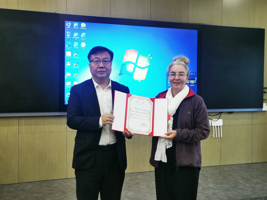 随后,郭炜向凯琳娜·马丁教授颁发客座教授聘书并发表讲话,他介绍了法语系团队力量,强调法语专业在2022年获批陕西省一流专业建设点之后,应该持续加强对外交流合作,凯琳娜·马丁作为我系的特聘教授,将推动我系进一步发展,实现全方位提升。